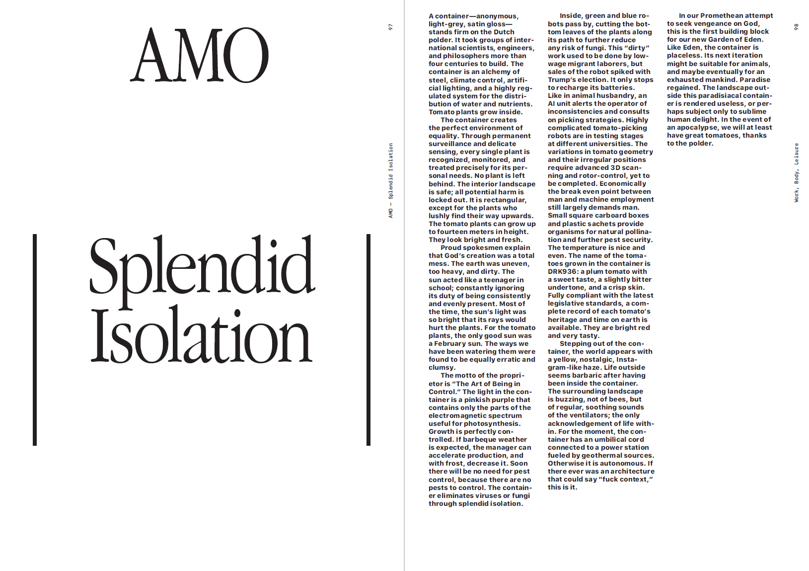 A container—anonymous, light-grey, satin gloss—stands firm on the Dutch polder. It took groups of international scientists, engineers, and philosophers more than four centuries to build. The container is an alchemy of steel, climate control, artificial lighting, and a highly regulated system for the distribution of water and nutrients. Tomato plants grow inside.